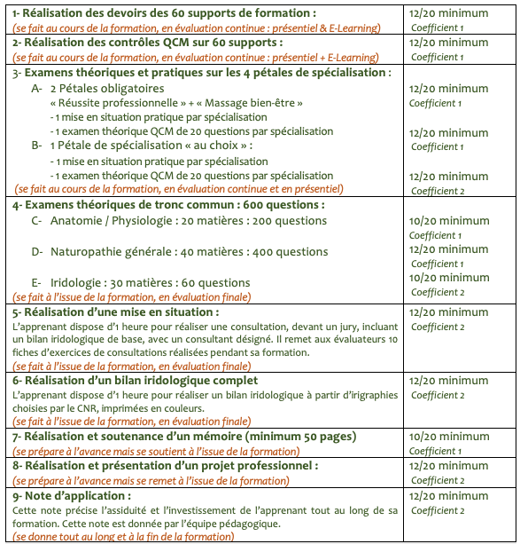 NB : la note finale de la moyenne générale doit être supérieure ou égale à 12/20. Les 10 heures d’examens finaux de naturopathie, d’anatomie-physiologie, d’iridologie, de mise en situation et de soutenance du mémoire se passent le vendredi et le samedi précédant la dernière Université d’été. Les résultats sont connus et donnés le mercredi, pendant le stage.
